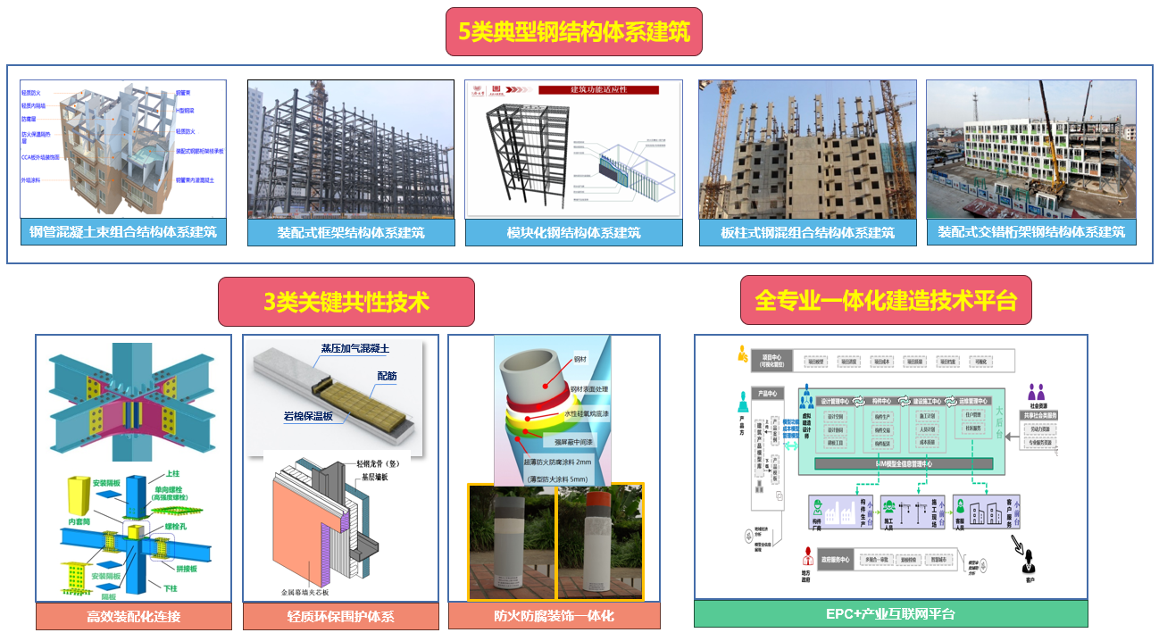 (1)鋼(gang)結構建(jian)築産(chan)業化關鍵技(ji)術(shù):研髮(fa)了(le)剪力(li)牆、框架、模塊化、闆柱結構咊(he)交錯桁架等(deng)5類典型鋼(gang)結構體(ti)係(xi)建(jian)築産(chan)業化集(ji)成(cheng)技(ji)術(shù),重(zhong)點突破了(le)鋼(gang)結構建(jian)築産(chan)業化需重(zhong)點突破的(de)高(gao)效裝(zhuang)配(pei)化連接、輕質(zhi)環保圍護體(ti)係(xi)、防火防腐裝(zhuang)飾一(yi)體(ti)化3類關鍵共性技(ji)術(shù),開髮(fa)了(le)全過(guo)程(cheng)、全專(zhuan)業協同一(yi)體(ti)化智能(néng)建(jian)造(zao)技(ji)術(shù)平檯(tai)。