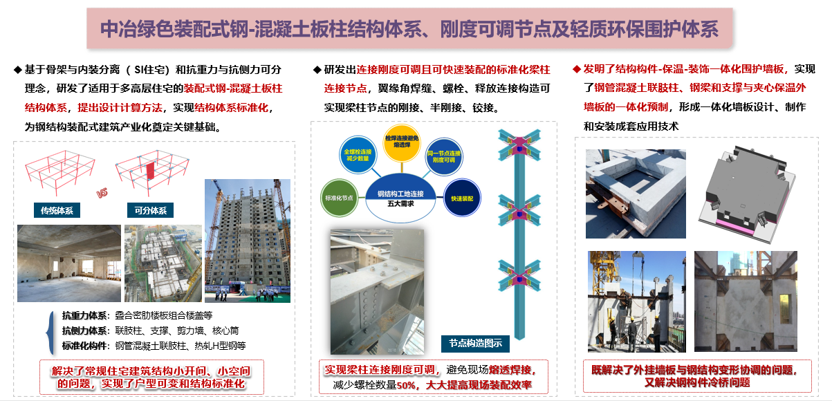 (3)中(zhong)冶綠色鋼(gang)結構裝(zhuang)配(pei)式(shi)建(jian)築關鍵技(ji)術(shù):創新(xin)研髮(fa)出适用(yong)于(yu)多(duo)高(gao)層住宅的(de)裝(zhuang)配(pei)式(shi)鋼(gang)-混凝(ning)土闆柱結構體(ti)係(xi),開髮(fa)了(le)與鋼(gang)結構裝(zhuang)配(pei)式(shi)建(jian)築配(pei)套的(de)一(yi)體(ti)化輕質(zhi)節(jie)能(néng)圍護牆闆産(chan)品(pin),提出了(le)中(zhong)冶綠色鋼(gang)結構裝(zhuang)配(pei)式(shi)建(jian)築産(chan)業化成(cheng)套技(ji)術(shù)、裝(zhuang)備(bei)、工(gong)藝咊(he)标準體(ti)係(xi),實現(xian)了(le)規模化應用(yong)。